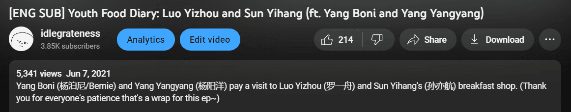 Based on YouTube analytics and seeing what search terms viewers were using to find my videos, I began including their Chinese names and stage names as well